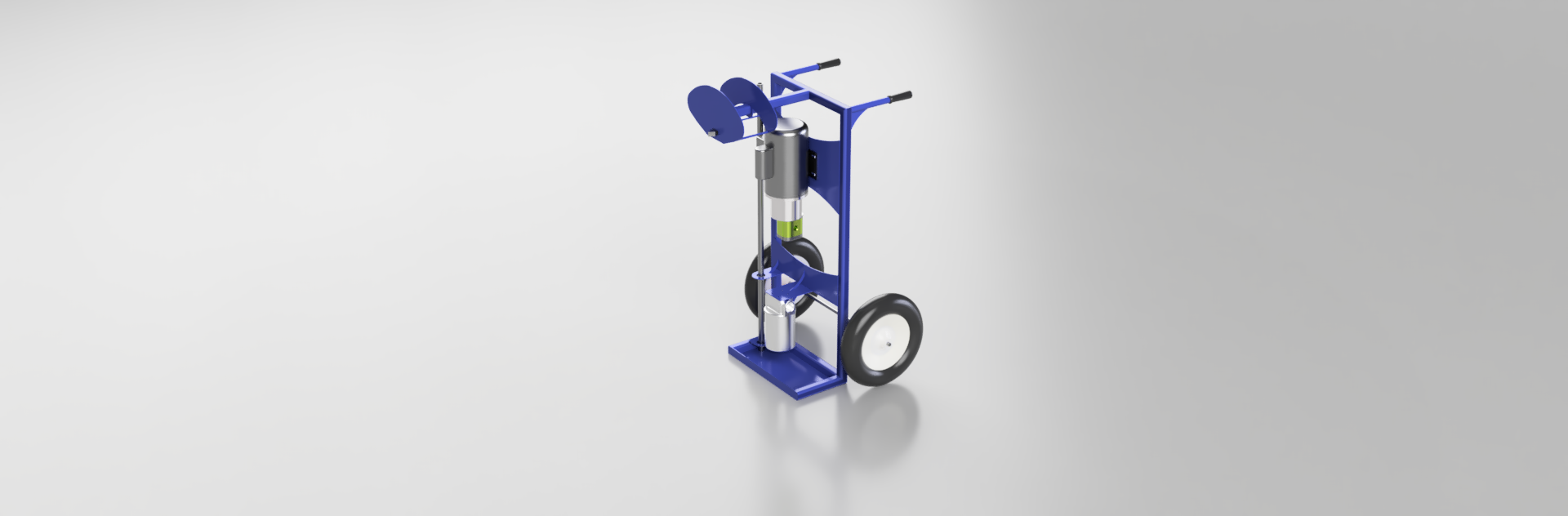 A blue manual hydraulic interventional cart with two large wheels, a handle on top, and a hydraulic pump mechanism.
